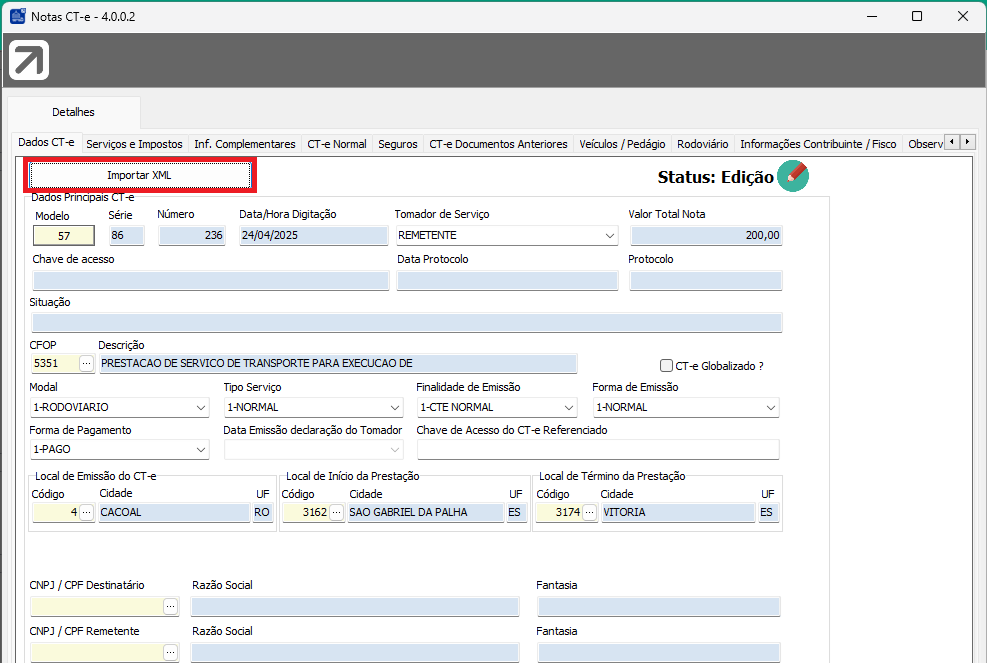 A tela acima será apresentada quando selecionado um XML através do botão Importar XML,