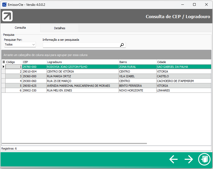Através da tela é possível navegar pela grid, através dos botões Anterior (F7) e Próximo (F8):