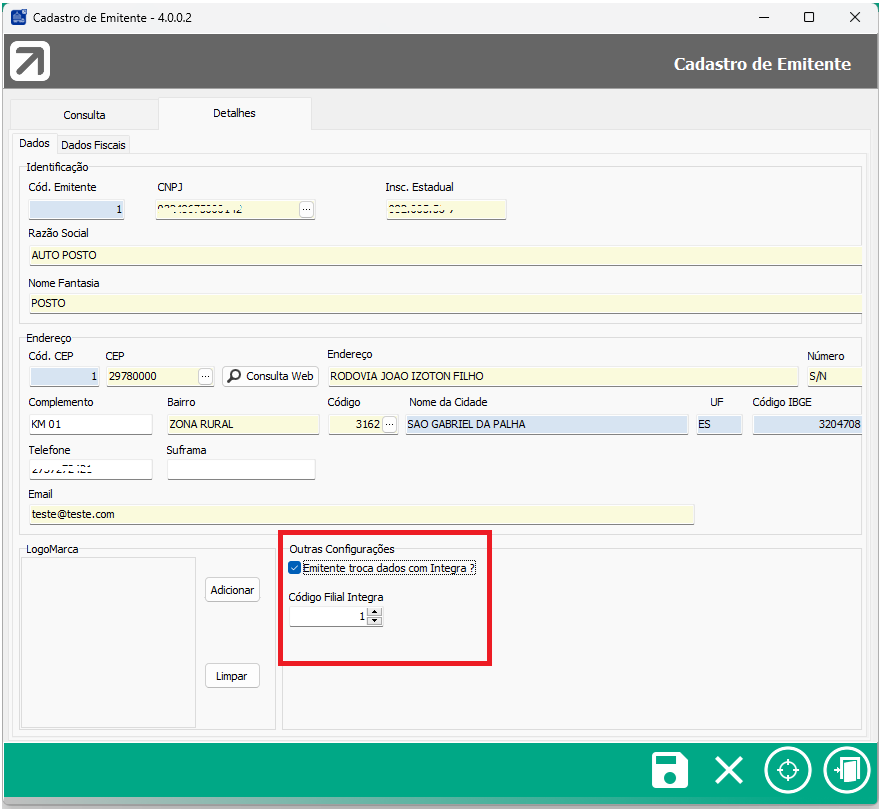 Para habilitar o modo de sincronismo com o Integra, é necessário habilitar o campo Emitente