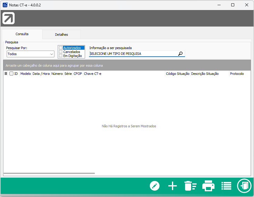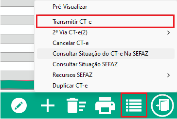 Tela para emissão de CT-e, consultas e demais opções relacionadas.