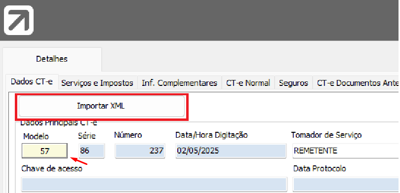 - Quando selecionado Modelo 57, o sistema habilitará a opção para Importar XML.