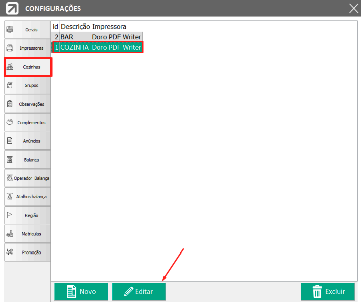 Abra o menu Cozinhas e selecione a cozinha que será utilizada para receber os pedidos para a produção, clique em Editar ou caso não tenha cozinhas cadastradas clique em Novo.