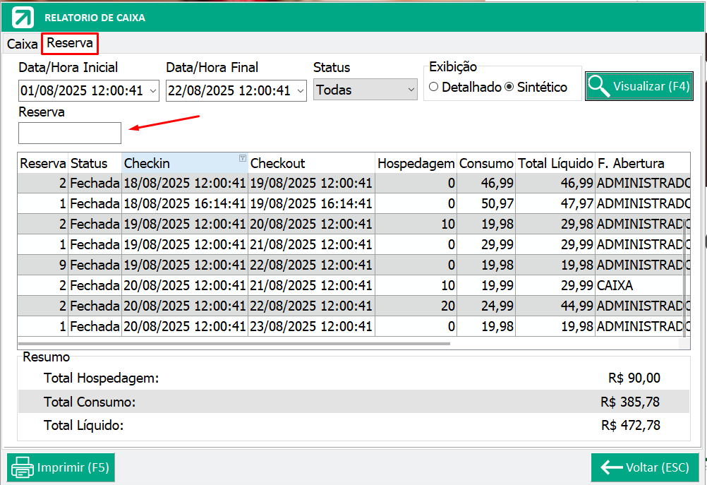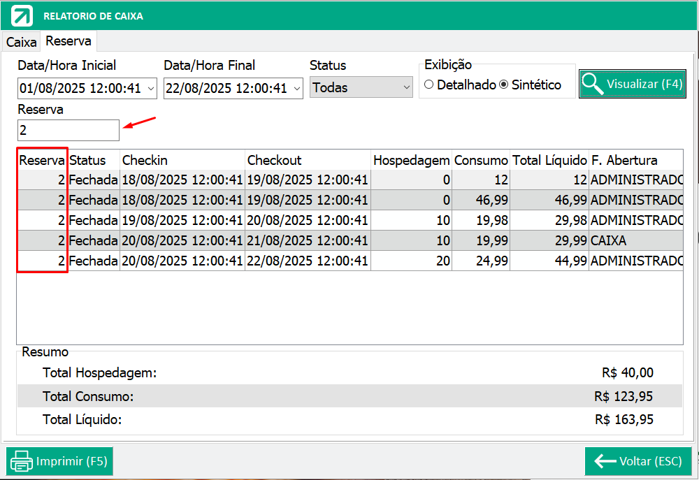Pesquisando pelas reservas de número "2" por exempo, só elas são apresentadas.