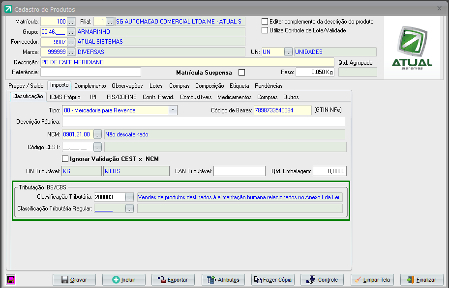 classificação de IBS/CBS e efetuar as modificações desejadas.