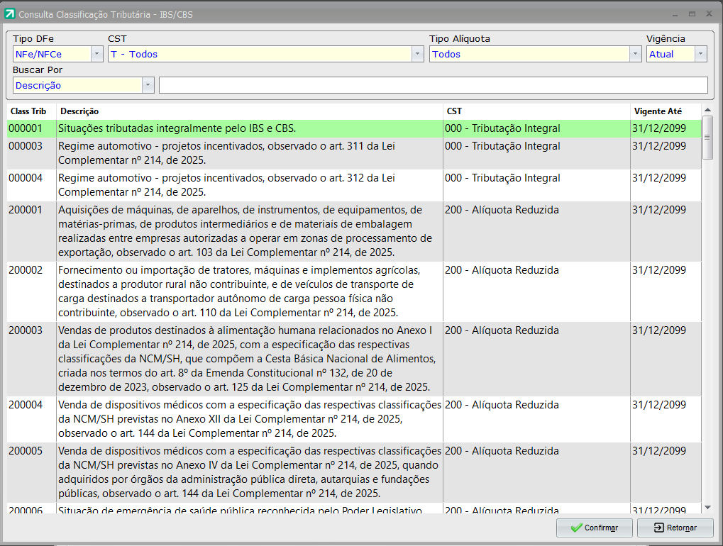 Ao selecionar a tela de consulta e seleção de Classificação Tributária, o usuário consegue de forma prática