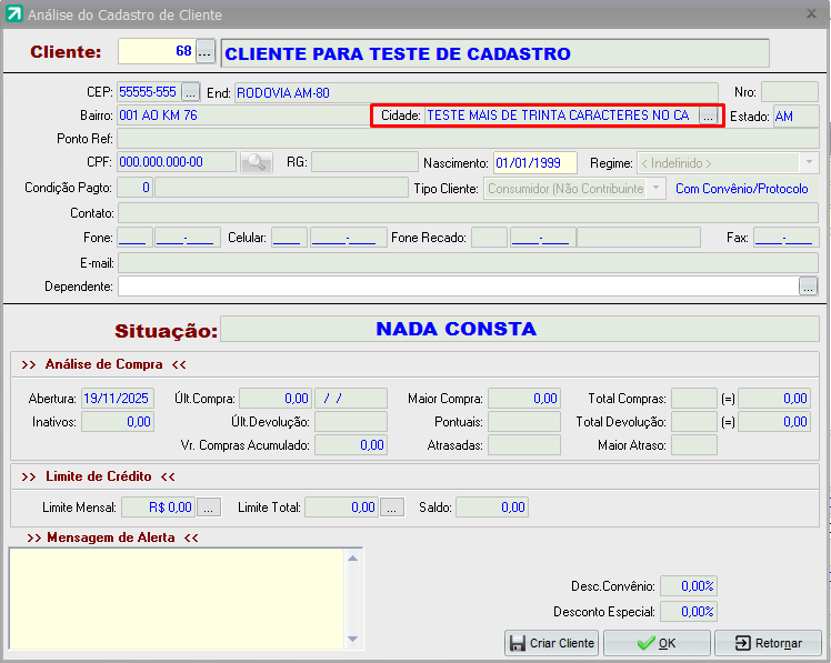 6) Realizado ajuste no campo "Cidade" na tela de análise de clientes durante a venda. Anteriormente, cidades com